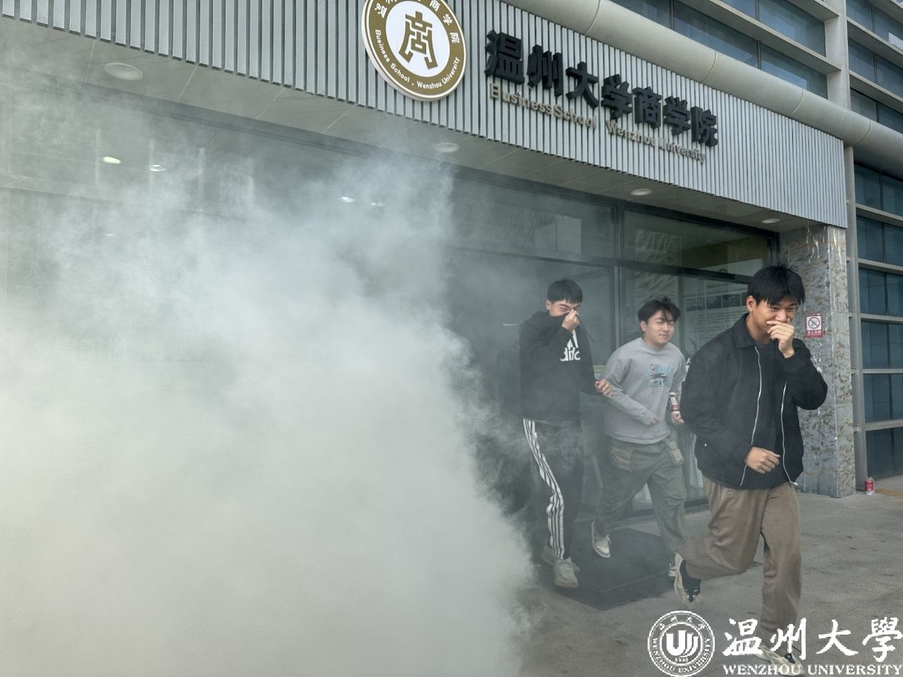 演练伊始,模拟烟雾在教学楼内迅速弥漫,现场模拟真实火灾环境。参与师生在保卫处工作人员和学院辅导员的统一指挥下,沉着冷静,严格按照“低姿弯腰、捂鼻靠右”的疏散要求,沿预定路线迅速有序撤离至安全区域。整个过程组织严密、配合默契,展现出师生良好的应急素养和协作意识。