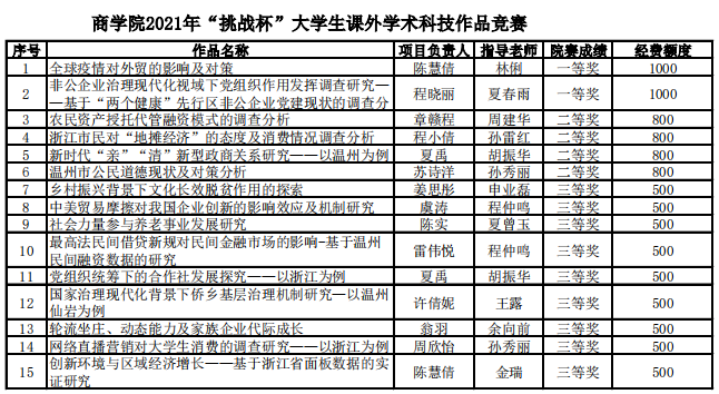 经过评委老师综合了文本评审、路演陈述及自由问辩等环节的评议,最终评选出院赛一等奖2项、二等奖4项、三等奖9项。同时,学院将予以各组(院一等奖1000元,二等奖800元,三等奖500元)项目孵化经费作为奖励。具体项目获奖名单如下: