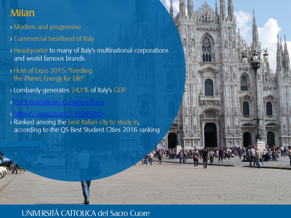 该校校址在意大利米兰,住宿和交通都较便利,费用适中。