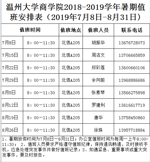 亚洲成人 2018-2019学年暑期值班安排表(2019年7月8日-8月31日)